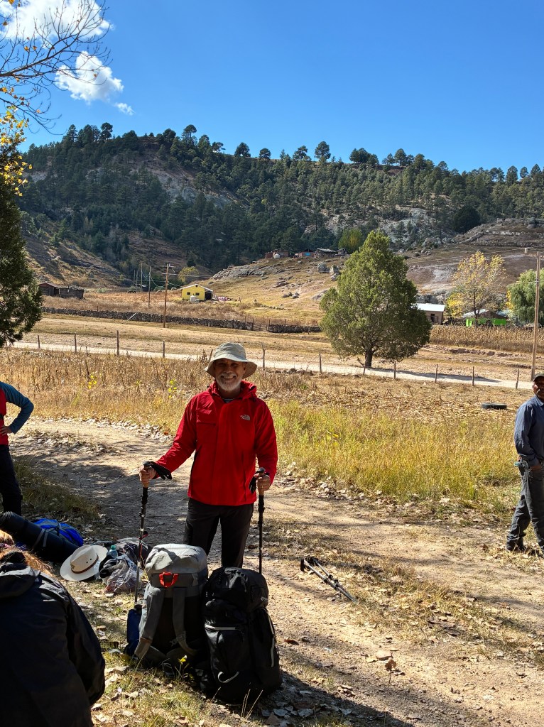 Allí, reorganizamos nuevamente nuestras mochilas, esta vez con la conciencia de que lo que cargábamos ya no era solo equipo, sino intención. Conocimos por fin a José Reyes, por todos conocido simplemente como Reyes, una persona profundamente amable y sumamente alegre, con una energía increíble que desmiente cualquier intento de calcular su edad —que, por cierto, ni él mismo conoce con certeza. Su presencia irradia confianza, y su sonrisa parece tener la capacidad de abrir senderos. También nos presentaron a los compañeros rarámuris que caminarían con nosotros durante toda la travesía: Juan Carlos, Marcial, Erik y Nacho. Sus rostros tranquilos y su andar ligero anunciaban que estábamos por entrar en un ritmo distinto, uno que no se mide en pasos, sino en presencia. No podría faltar también el ofrecimiento de artesanías: canastos tejidos, cintas de colores, pulseras, etc. Comprar estas artesanías es una manera de apoyar la economía familiar. Cydi saco de su mochila un bonete, el cual comento que al lavarlo y secarlo se había encogido, a uno de los pequeñines le quedo perfecto.