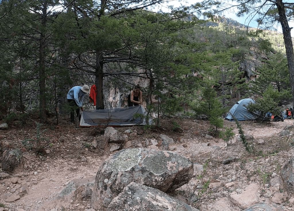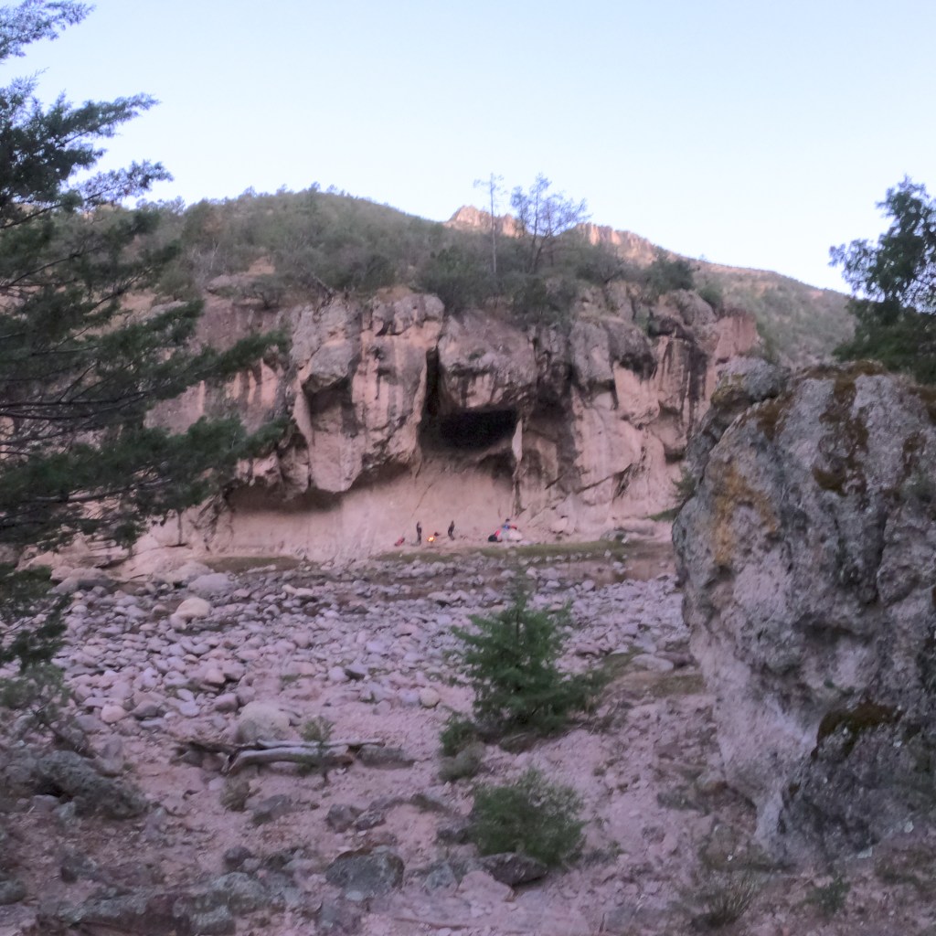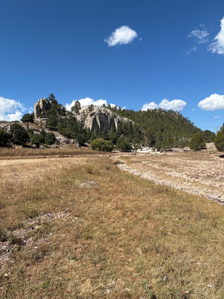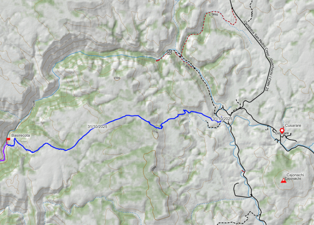 A medida que nos acercábamos a Basirecota, el paisaje se abría. Aparecieron formaciones rocosas, pequeños arroyos, y esa luz dorada que solo se ve en la sierra por la tarde. El primer campamento se instaló a orilla del río Cusarare, en un claro rodeado de árboles y con espacio suficiente para las tiendas. El lugar tenía algo de sagrado, como si nos hubiera estado esperando. Allí también se encuentran aguas termales, que Dalila y las compañeras del equipo supieron aprovechar con alegría y merecido descanso, como si el agua tibia les reconociera el esfuerzo del día.