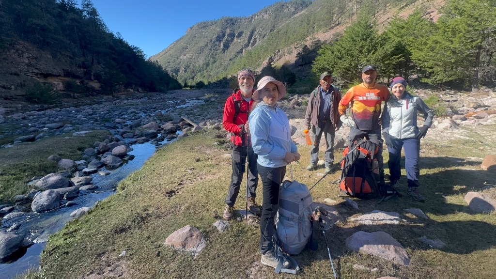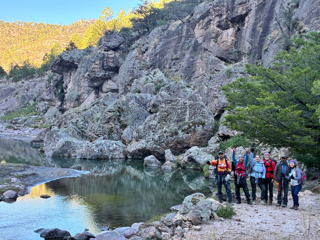 El paisaje cambiaba con cada curva: pastizales abiertos, formaciones rocosas, y cañones que se desplegaban en silencio majestuoso. El río aparecía y desaparecía en el fondo de la barranca, como un hilo de plata en la vasta cañada. Las pausas eran breves: un sorbo de agua, un respiro compartido, una mirada que decía más que las palabras. Poco a poco, el grupo se afirmaba como un solo cuerpo, avanzando hacia el destino común.