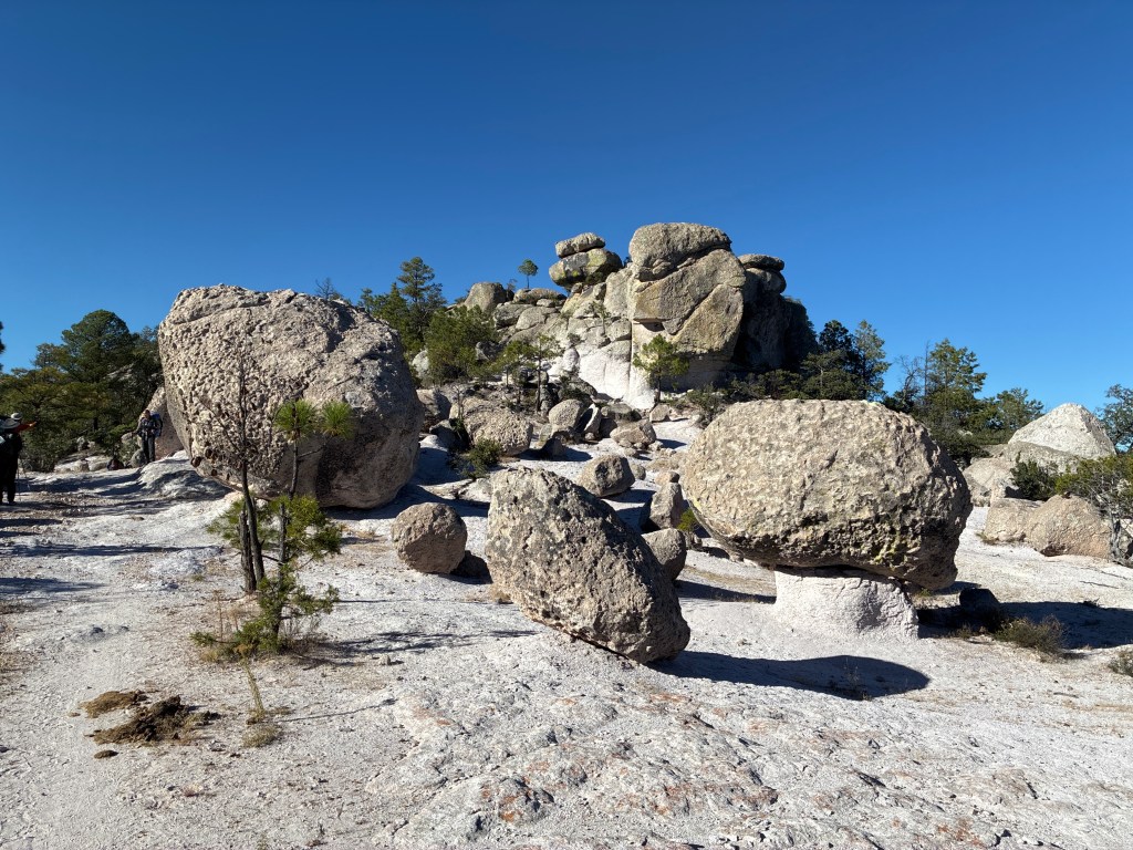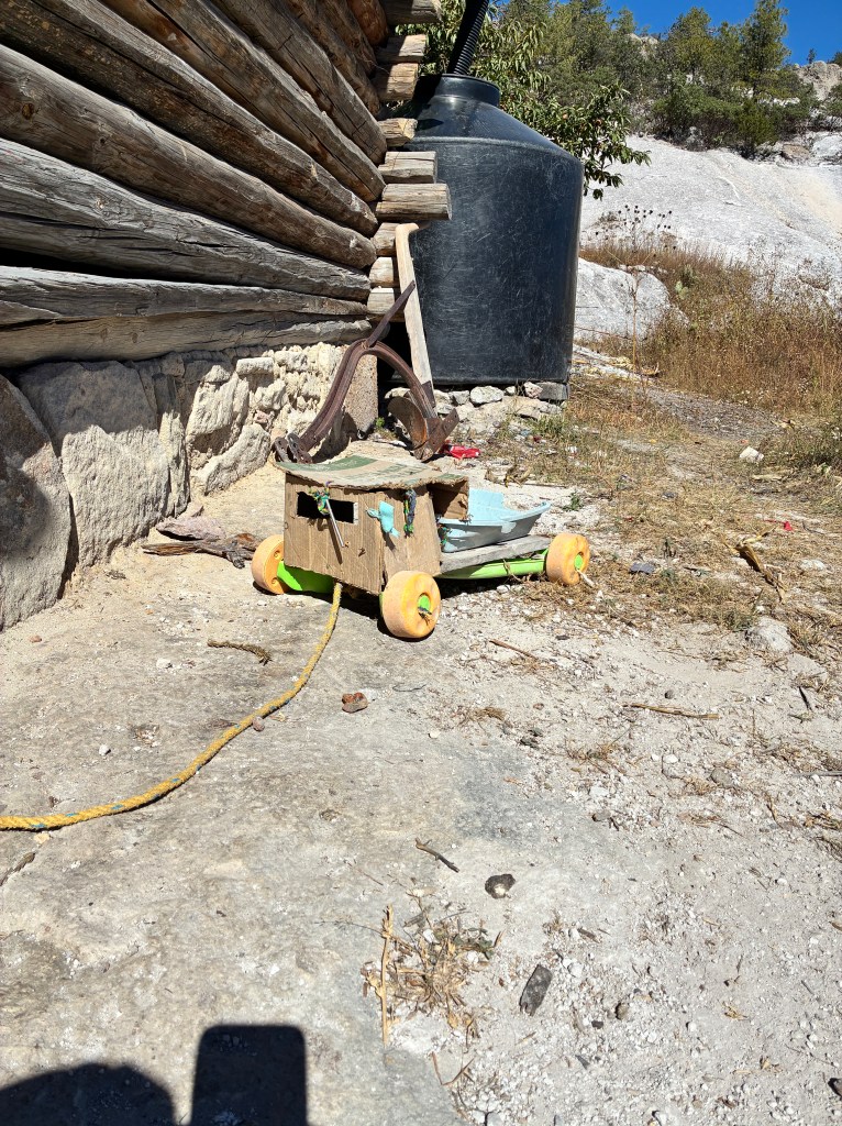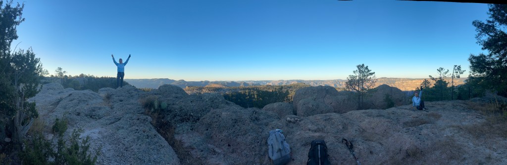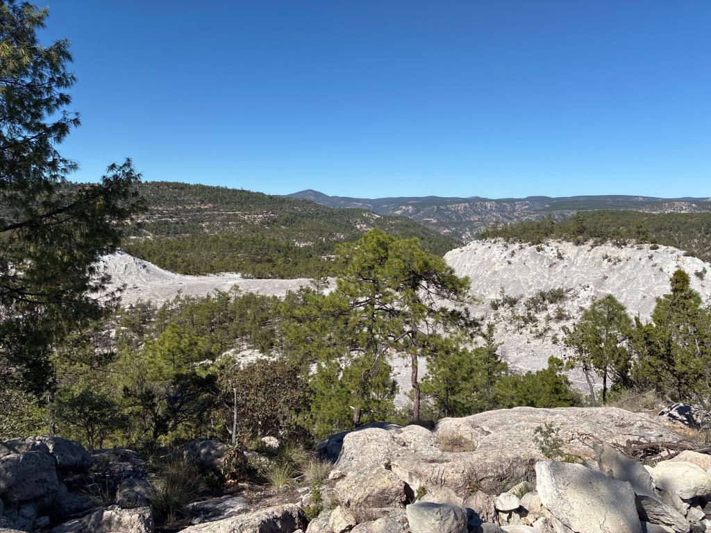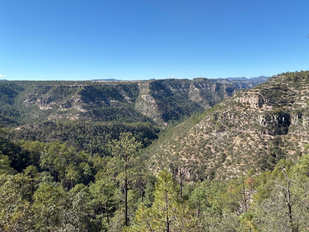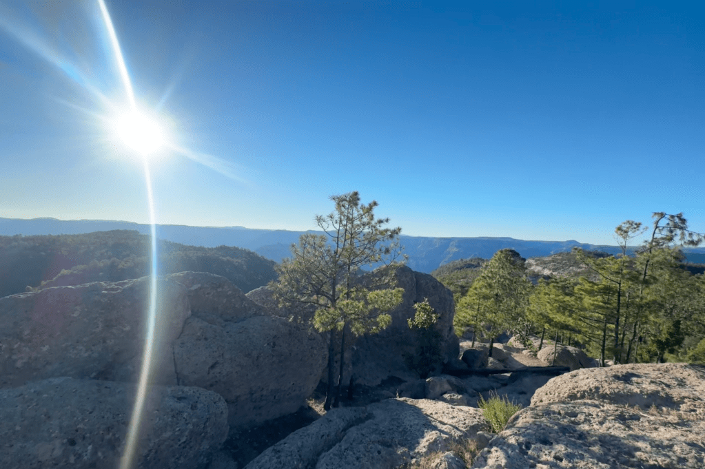 Los primeros 3 a 4 kilómetros fueron difíciles, la pendiente exigía esfuerzo constante y el cuerpo apenas comenzaba a despertar. Sin embargo, las vistas eran hermosas, con el cañón desplegándose en formas majestuosas que compensaban cada paso. Después del kilómetro 4 alcanzamos la cima de la barranca, una meseta amplia con cañones a ambos lados que nos regalaba una perspectiva distinta del paisaje. Desde allí seguimos subiendo, aunque la pendiente se aligeró; aun así, los kilómetros pesaban y el avance se volvía más lento, marcado por la resistencia y la voluntad compartida. A media meseta llegamos a Huetosach, llamado así por sus alrededores blancos. Aquí tomamos un breve descanso en la morada de una familia rarámuri, aprovechamos nuevamente para ver y comprar artesanías.